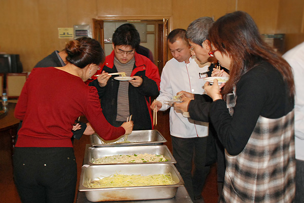 本次厨艺大赛的选手来自饮食部的7支参赛队,分为刀工组和大灶菜组。在比赛中,各位选手轮番上场,认真制作。刀工组选手上下翻飞,切出的土豆丝、萝卜块和白菜片整齐均匀,一丝不苟;大灶菜组选手挥舞铲勺,素炒土豆丝、尖椒干豆腐香气扑鼻,色泽诱人。虽然比赛项目只是普通的家常菜,但这也正是检验参赛者基本功的最好方法,能把简单的菜肴做到色香味俱全,别有一番风味更需要选手们在平时工作中的积累和钻研。