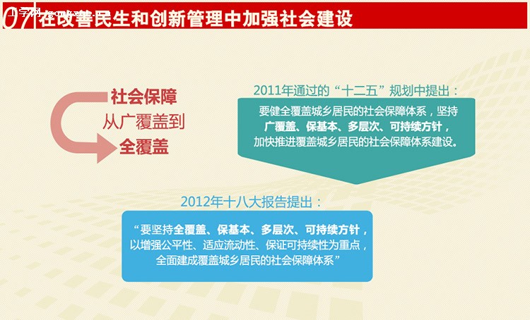 关键词:社会保障从“广”覆盖到“全”覆盖。社会保障从广覆盖到全覆盖,一字之差,要求、内涵、责任大不相同。它反映了在建立社会主义市场经济体制过程中,在经济不断增长的同时,要同步改善人民生活,不断为广大民众建立健全更好的社会保障体系。在提出统筹推进城乡社会保障体系建设中,明确提出社会保障是保障人民生活、调节社会分配的一项基本制度。基本的东西是非常重要同时不能缺少的,把社会保障作为一项基本制度来看待,极大地提升了社会保障的地位。事实上,也只有从这个高度来认识,才能进一步搞好社会保障建设,才能为市场经济保驾护航,才能更好地保障人民生活,使之成为调节收入分配的一个重要手段。