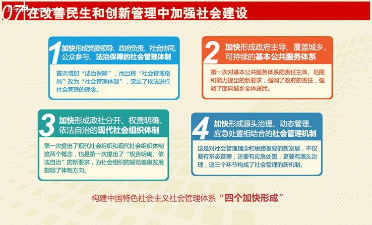 关键词:“四个加快形成”。十六届四中全会以来,“党委领导、政府负责、社会协同、公众参与”一直是社会管理格局的内涵。十八大报告在原来的基础上增加了“法治保障”,并将“社会管理格局”改为“社会管理体制”,表述更加准确,内涵更加丰富,突出了依法进行社会管理的理念。