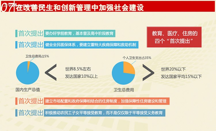关键词:教育、医疗、住房的四个“首次提出”。十八大报告提出了包括教育、社会保障、医疗、住房等关系群众切身利益的一系列问题。报告不回避现实问题,同时为百姓勾勒出了未来生活新图景,给民生问题解决提供了广阔的思路,让人们看到了惠及全体人民的社会体制改革的完整设计,也读出了执政党把握民生脉动的现实追求,让人坚信中国人民生活会越来越好。