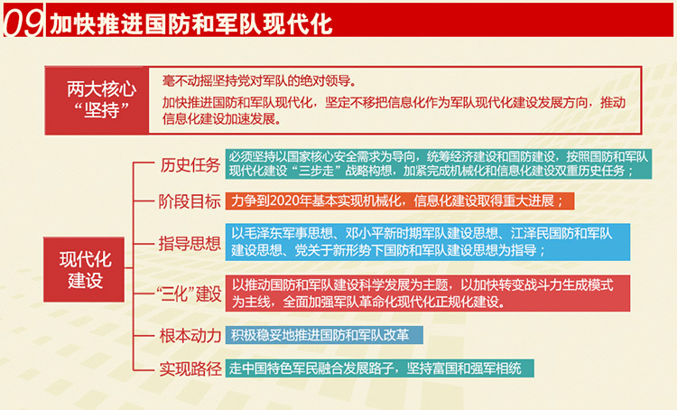 关键词:两大核心“坚持”。一是坚决听从党中央的指挥,这是我党历来的重要思想。二是国防和军队现代化。现代化是军队建设的中心任务。随着时代条件和战争形态加速演变,信息化已经成为军队现代化的本质规定性。正是基于对军队现代化时代内涵的准确把握,党的十八大报告提出要坚定不移把信息化作为军队现代化建设发展方向,推动信息化建设加速发展。