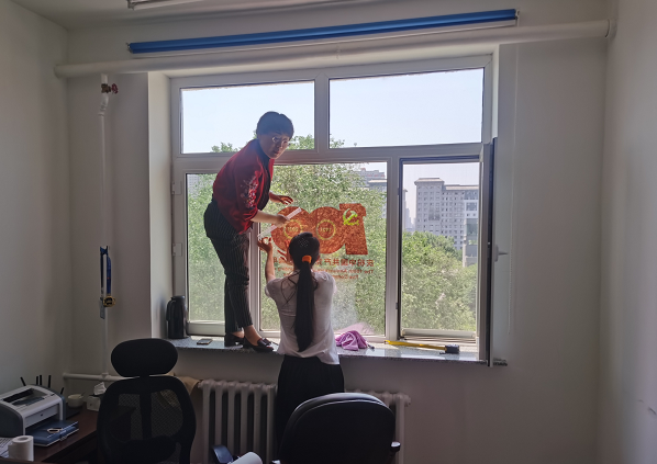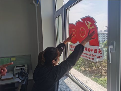 在粘贴标志过程中,党员们不忘向同事们解读标识的深层含义,加深了对我党百年历史的了解,更好的投入到“学党史 悟思想 办实事 开新局”活动中去。