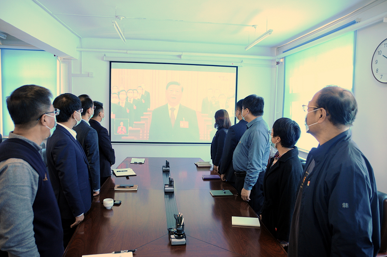 后勤集团中心组成员在27号办公楼402会议室集中收看学习党的二十大开幕盛况。集团各党支部采取线上、线下的方式组织党员集中收看。