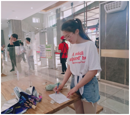 在第二阶段的活动中,食堂管理员王博带领17名预备党员在美食城四个楼层开展了食堂综合服务满意度调查问卷实践活动。同学们分组进行,分工合作,高效有序地完成了问卷调查工作。