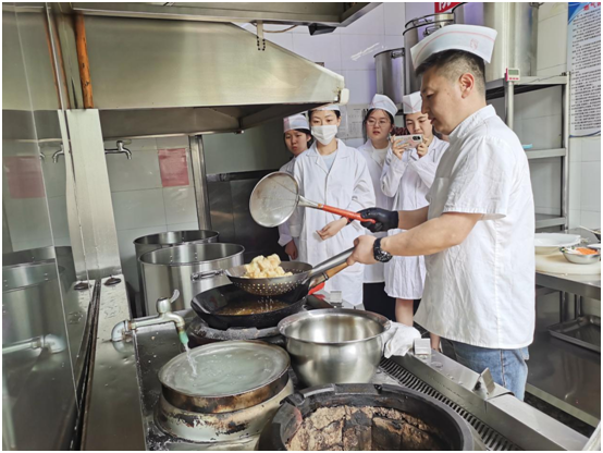 为深入贯彻习近平新时代中国特色社会主义思想主题教育工作方案,进一步深化“五个行动方案”,提升服务育人和实践育人工作,后勤集团产业党支部成功举办了第二期美食小课堂活动,于6月15日在国际交流中心开展。此次活动旨在为学生提供劳动实践机会,将劳动教育融入学生日常生活,通过学习菜品制作的过程中感受工匠精神,引导学生崇尚劳动、尊重劳动、乐于劳动。共有10名同学参加了本期美食小课堂活动,并由国际交流中心行政总厨杜广航和面点师张丽担任讲师。