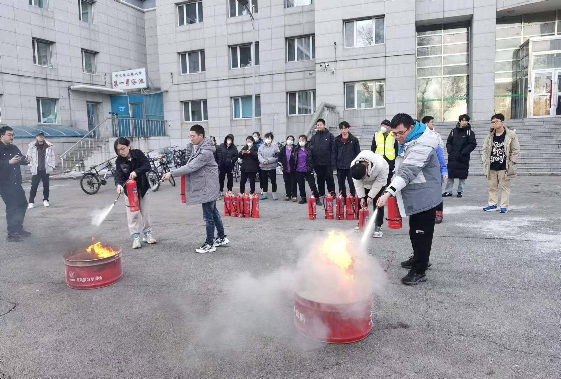 在演练过程中,工作人员镇定地拨打119火警以及学校报警中心电话并及时断电,同时有序地组织学生疏散,引导他们用湿毛巾捂住口鼻,沿紧急通道撤离至安全区域。随后,学生们在安保处工作人员的指导下,成功地操作灭火器,展示了学习成果。