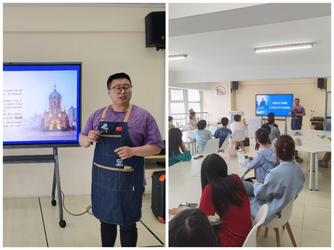 课程开始前,公寓中心的管理人员李伟健向同学们介绍了哈尔滨独特的异域风情和特色饮食文化。他介绍道,哈尔滨不仅是国家历史文化名城,也是著名的旅游城市和国际冰雪文化名城。哈尔滨的咖啡文化源远流长,最早可以追溯到19世纪,1898年随着中东铁路的修建,由外侨带到哈尔滨,拥有百年的历史。最近,随着“冻梨咖啡”、“冻柿咖啡”、“澡堂咖啡”等创新产品在网络上走红,让人们感受到传统咖啡文化与这座城市奇妙的化学反应。