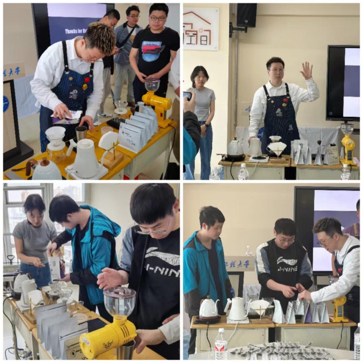 在互动实操环节,麦老师现场演示了手冲咖啡的完整制作过程,特别讲解了滤纸的折叠、水壶的使用以及不同的冲泡技巧。在麦老师的指导下,同学们亲自参与制作咖啡,从选择适当的水温和咖啡分量,到冲泡与装饰,每一个步骤都充满了挑战与乐趣。