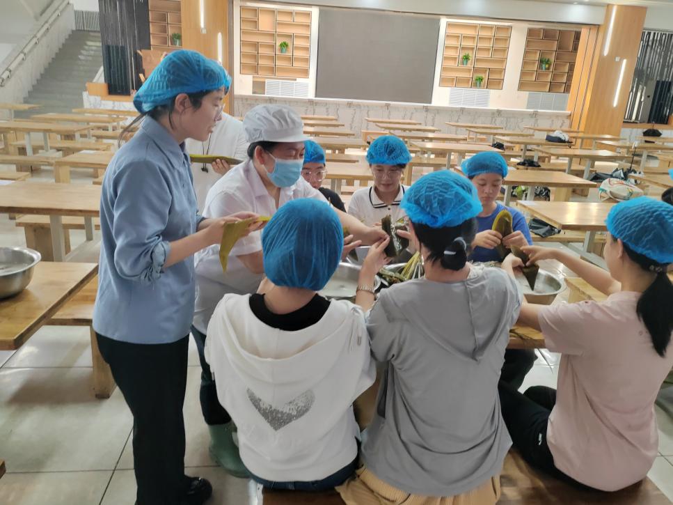 在食堂工作人员的耐心指导下,同学们系统地学习了泡粽叶、处理糯米、包扎粽子等劳动技巧,并亲自动手实践。大家分工合作,相互帮助,共同完成了一个个美味可口的作品,活动现场粽香四溢,充满了欢声笑语。