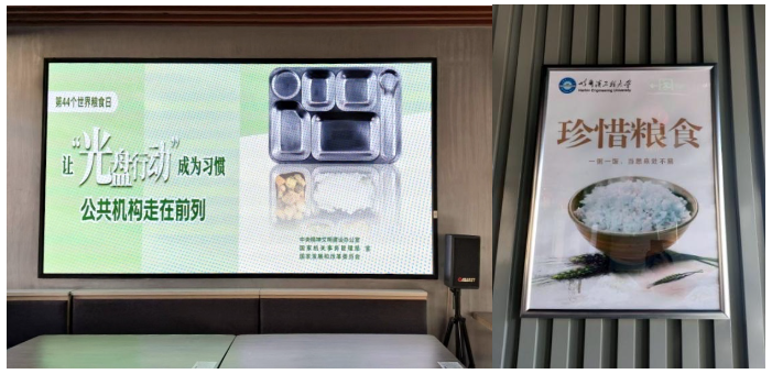在活动开始前,后勤集团就通过电子屏幕播放节约粮食的宣传图片和文字,同时在食堂大厅设立宣传点,通过多种形式向师生普及“世界粮食日”的相关知识,为活动预热。