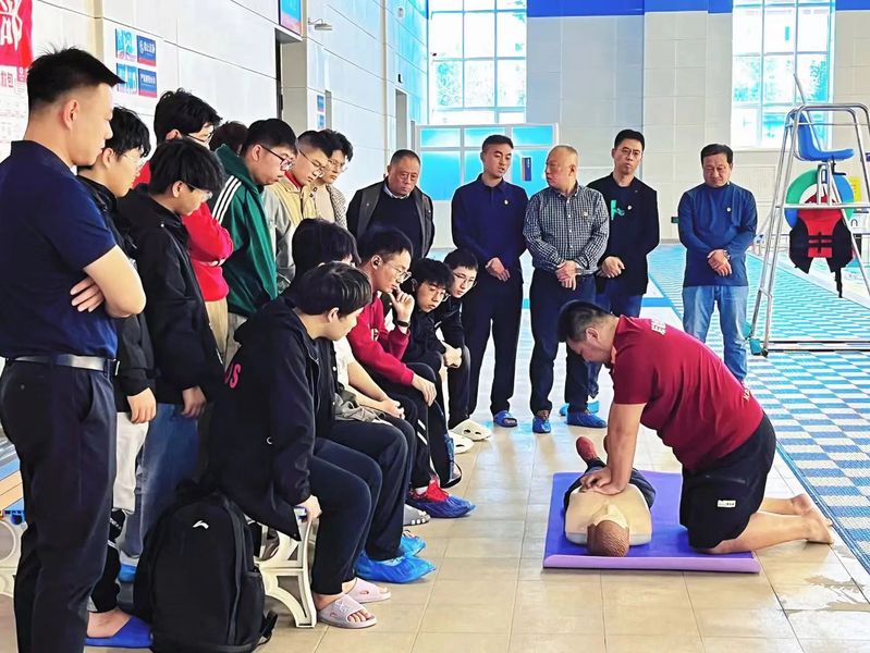 活动的第二部分是学习胸外按压法和溺水自救法。救生员刘俊鹏从事救生行业多年,经验丰富,他首先对心肺复苏(CPR)的重要性进行了强调,随后通过现场演示,手把手指导学生如何正确进行胸外按压,使同学们更直观的感受到拥有急救知识的重要性。