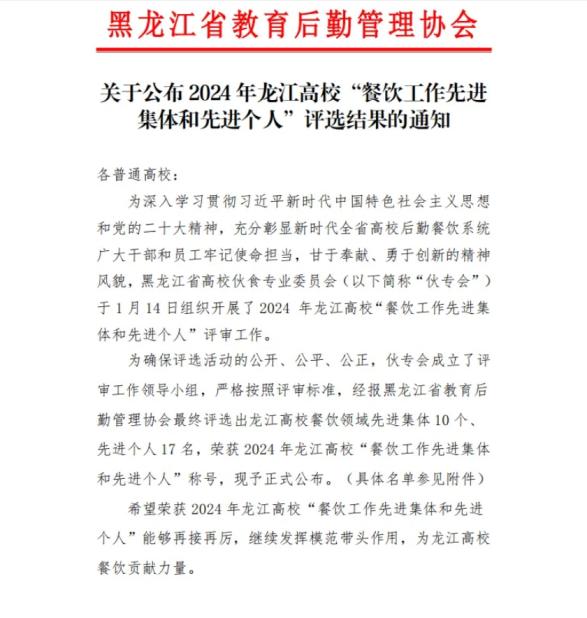 近日,我校后勤集团饮食中心被黑龙江教育后勤管理协会评为“餐饮工作先进集体”。